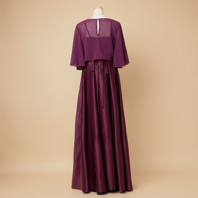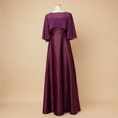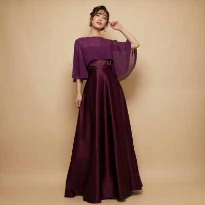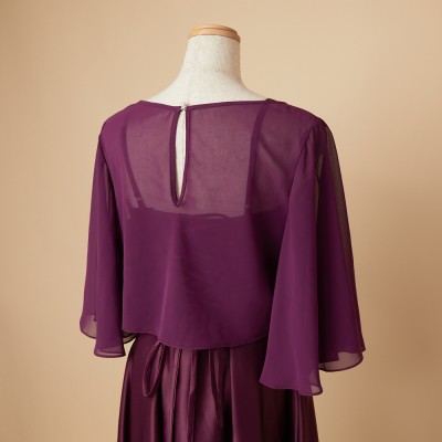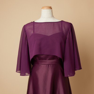 透け感のある軽やかなシフォン生地を使用した、プラムカラーのフレアスリーブケープボレロ。腕周りが動かしやすいようフレアスリーブデザインを採用することで、見栄えの美しさと機能性を兼ね備えた万能なケープボレロです。