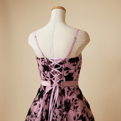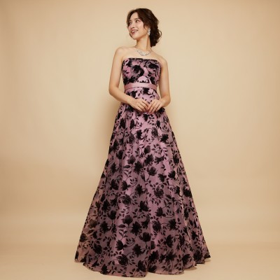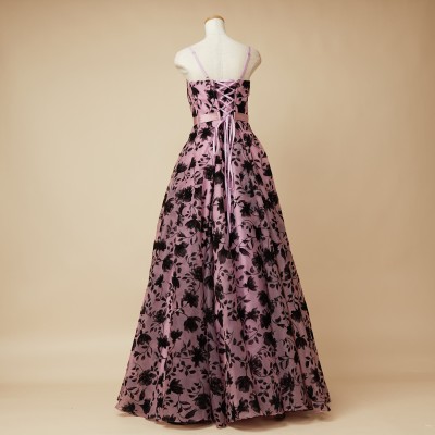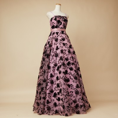艶やかなオーガンジーに印象的なブラックフラワーフロッキーをプリントしたAラインフレアドレス。立体的に見えるよう柄に柔らかな陰影を付けた、デザイナーこだわりフロッキープリントがポイントです。オペラモーブの可愛らしいピンクカラーがブラックカラーをひと際引き立てるエレガントなステージドレスです。