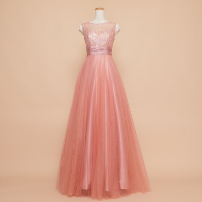 愛くるしいピーチオレンジカラーのスレンダースタイルドレス。鮮やか過ぎないペールトーンなので、キュートさを残しつつも大人な雰囲気に。柔らかなチュールスカートにちりばめられた微小なグリッターの繊細な輝きと、身頃のスパンコール刺繍レースの煌めきがとても優雅です。ウエストの幅広サテンギャザーが身頃をコンパクトに見せるのでスタイルアップ効果も期待できます。