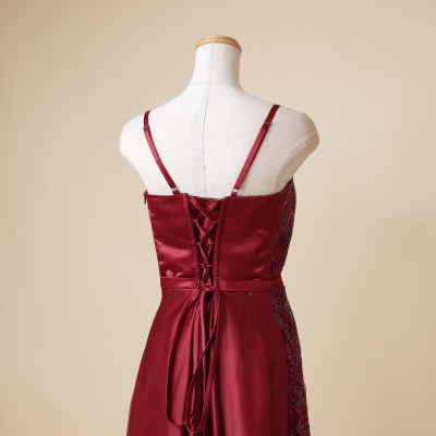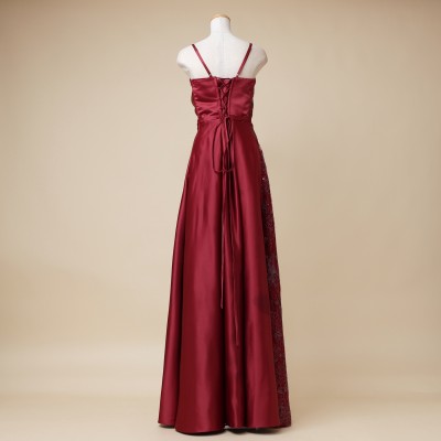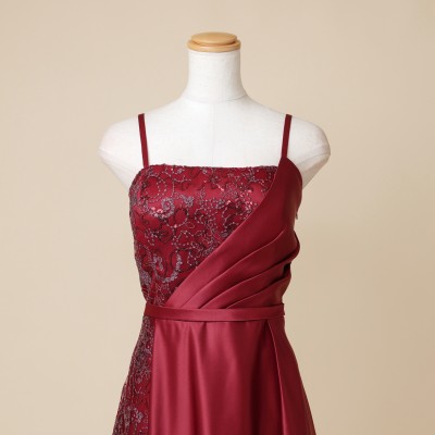 落ち着きあるマットな生地感の中に、美しく浮かび上がるデザインスパンコール生地をポイント使いしたハイセンスなステージドレス。主張し過ぎない程よい華やかさがとても魅力的です。パニエを使用してスカートデザインを生かした着こなしもおすすめ。大人の女性にぴったりな品あるワインカラー。