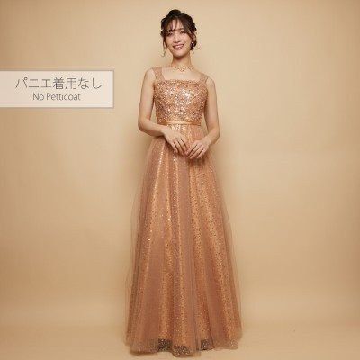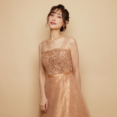 エスニックなゴールドブロンズカラーのチュールフレアドレス。ビーズやスパンコールの装飾をふんだんにあしらった、胸元の豪華な装飾の煌びやかさに目を惹かれます。スカートにもビーズやスパンコールの華やかな装飾があるので、パニエを使ってスカートを広げた着こなしがお勧めです。