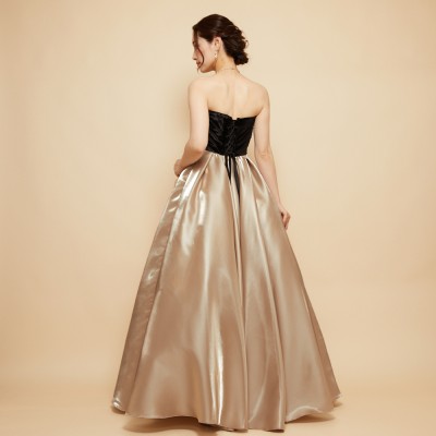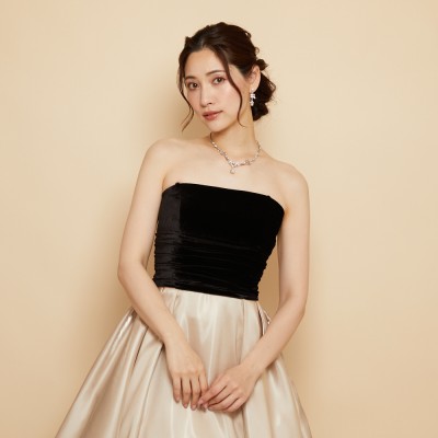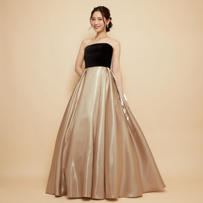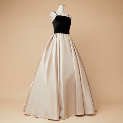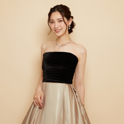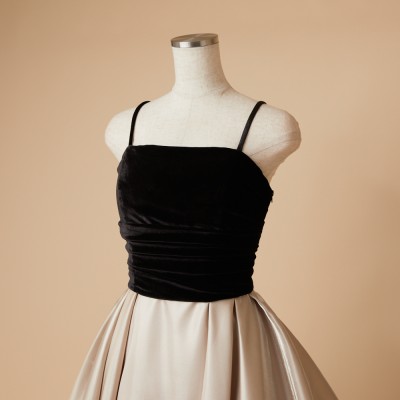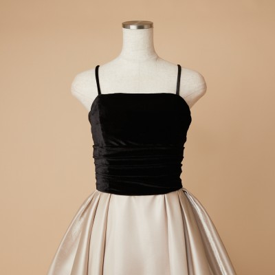 ベロア×サテンの異素材を使用した、ふんわりボリュームタックスカートドレス。ブラックカラーのベロア素材に、艶々光沢のシャイニーサテン生地のボリュームスカート。異素材&バイカラーのデザイナーいち押しの洒落なデザインです。ミルクたっぷりのクリーミーカフェラテをイメージした、優しさ溢れる上品なラテカラーです。