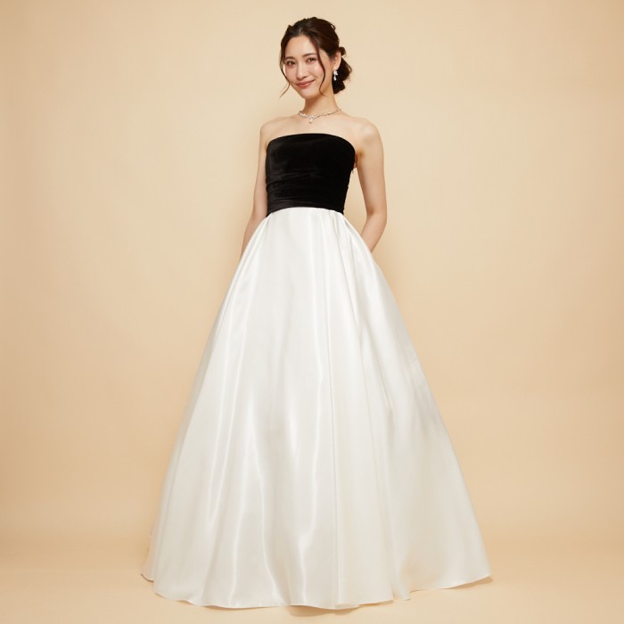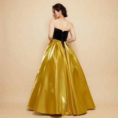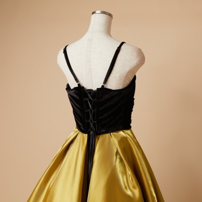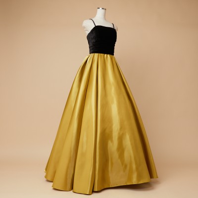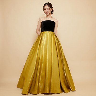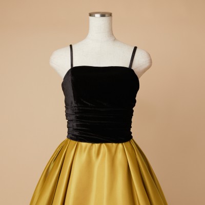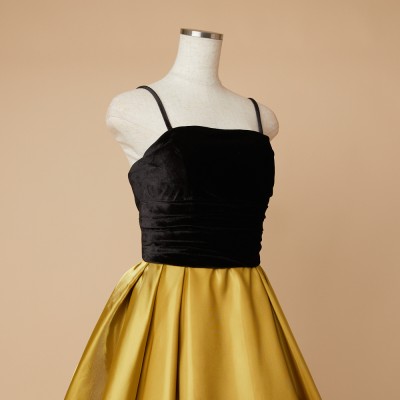 ベロア×サテンの異素材を使用した、ふんわりボリュームタックスカートドレス。ブラックカラーのベロア素材に、艶々光沢のシャイニーサテン生地のボリュームスカート。異素材&バイカラーのデザイナーいち押しの洒落なデザインです。花嫁様にも大人気!個性的で大人なマスタードカラー。