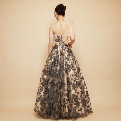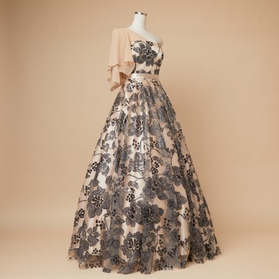 シャンパンベージュワンショルダーデザインフラワー刺繍ドレス