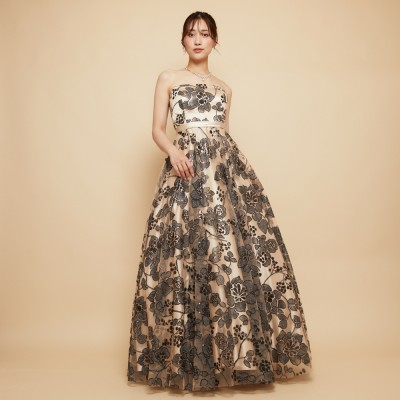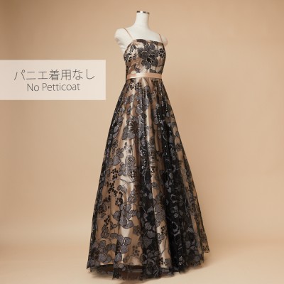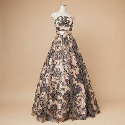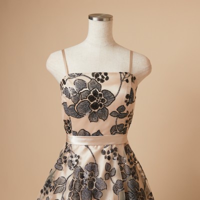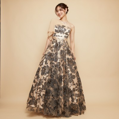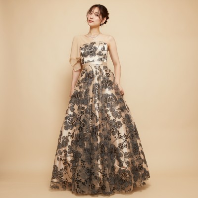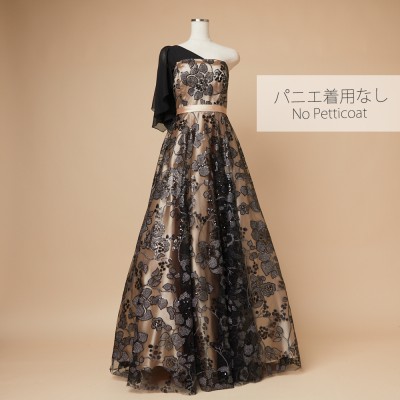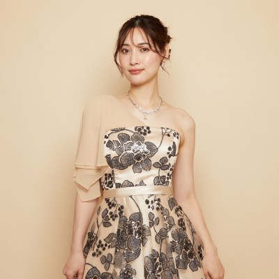 シャンパンベージュカラーにブラックフラワースパンコール刺繍チュールを重ねた、個性派Aラインフレアドレス。ワンショルダードレスとしても着用可能な、着脱式ベージュシフォンフレアショルダーが付属。身頃は、肩紐のみ・ワンショルダー・ベアトップの3wayでの着こなしが可能なので、ぜひお好みのスタイルでご着用ください!