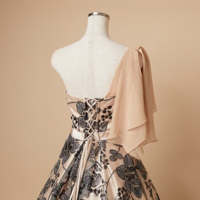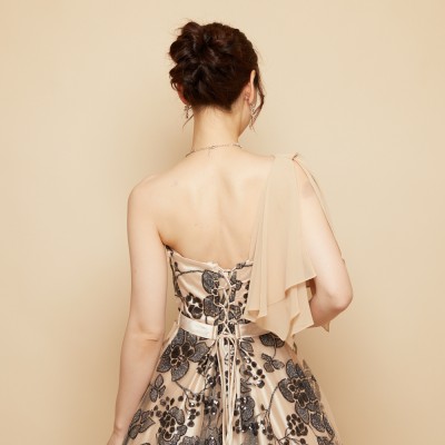 • シャンパンベージュワンショルダーデザインフラワー刺繍ドレス