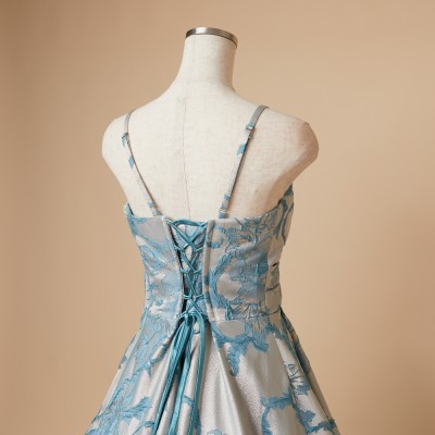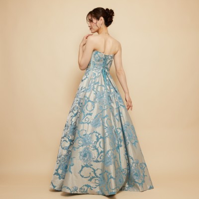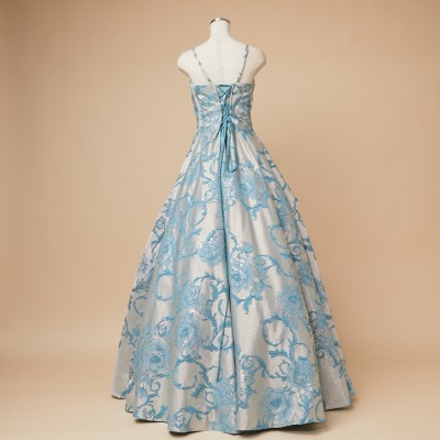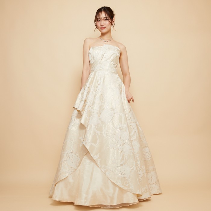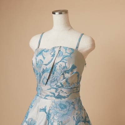 どこか荘厳な雰囲気を感じさせるジャガード生地を贅沢に使用したボリュームドレス。パニエでさらにボリュームアップして、スカートのレイヤースタイルを生かした着こなしがおすすめ。ゴールドベージュのベースカラーにティールグリーンの差し色が華やかなステージドレスです。