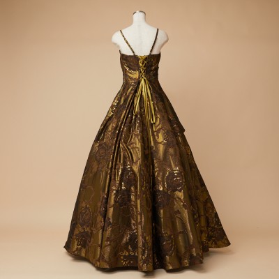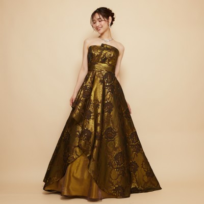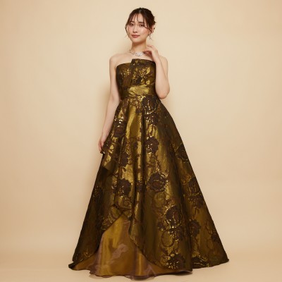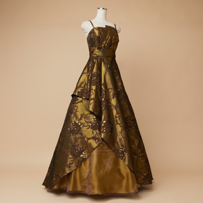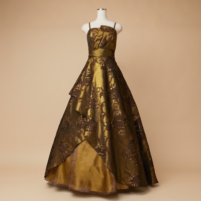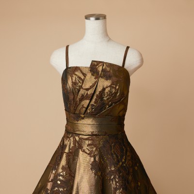 どこか荘厳な雰囲気を感じさせる華やかジャガード生地を贅沢に使用したボリュームドレス。オリーブブラウンのエキゾチックなカラーリングが個性的でミステリアスな印象に。パニエでさらにボリュームアップして、スカートのレイヤースタイルを生かした着こなしがおすすめです。