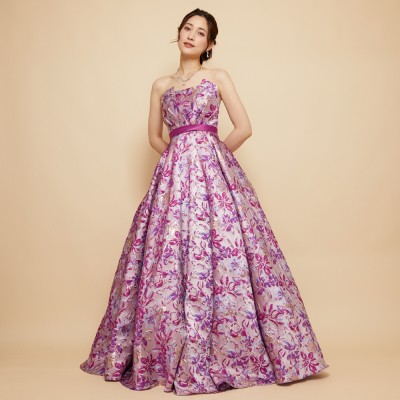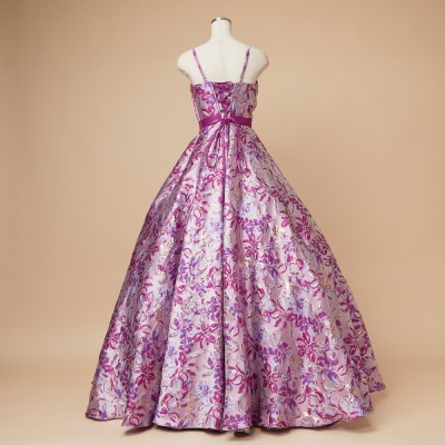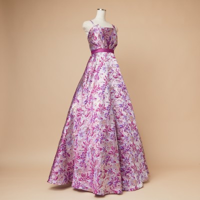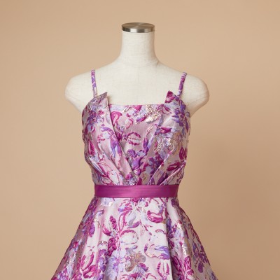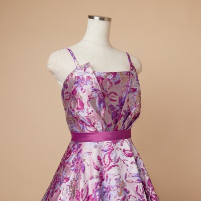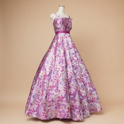 ぱっと華やぐ色彩のマゼンタカラーが目を惹く、ウエストラインのきゅっと締まったAラインフレアドレス。ゴールドのラメ糸が混ざった豪華な総柄ジャガード生地をたっぷり使った、贅沢な広がりのフレアスカートがポイントです。硬い生地の多いジャガードですが、こちらはふんわりとした優しい手触りが特徴。華やかな色合いの3色展開なので、トリオ演奏等お色違いで揃えてのご着用もおすすめです!