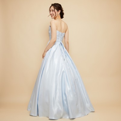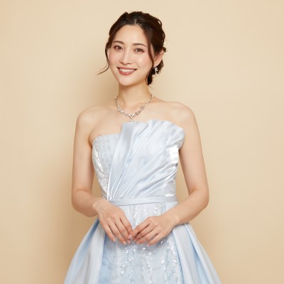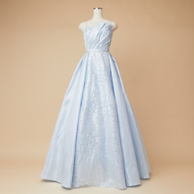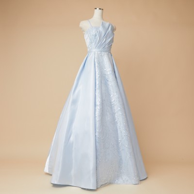 澄み切った雪解け水のようなアイスブルーカラーの艶やかな光沢が美しいシャイニーサテンフレアドレス。上品な淡いカラーリングに、華やかな胸元のフリルタックがワンポイント。スカートのセンター部分には、水面に反射する木漏れ日が波紋のように連なったクリアスパンコール装飾生地を使用。控えめながらもキラキラとしたエレガントな輝きも魅力です。