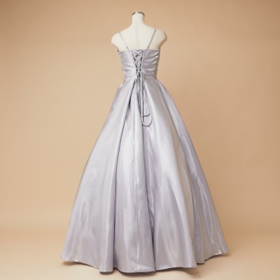 ひんやりとしたアイスシルバーカラーの艶やかな光沢が美しいシャイニーサテンフレアドレス。クールなカラーですが、胸元のフリルタックが華やかなアクセントになります。スカートのセンター部分には、氷の結晶が連なったようなクリアスパンコール装飾生地を使用。控えめながらもキラキラとしたエレガントな輝きも魅力です。