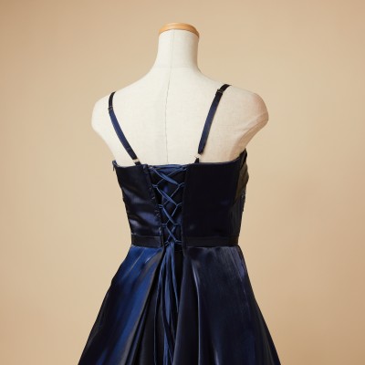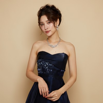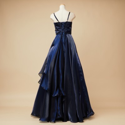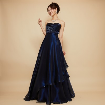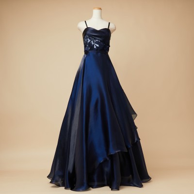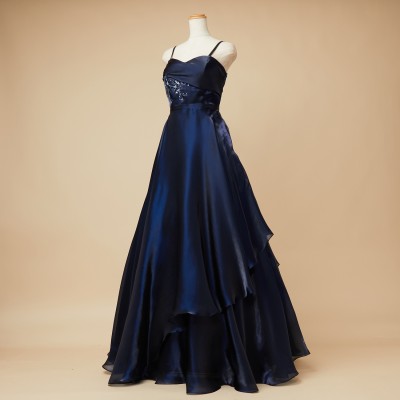 艶やかな光沢のディープネイビーカラーサテン生地を使用した、アシンメトリーレイヤースカートドレスです。胸元のさりげないスパンコール刺繍がデザインのアクセント。比較的重さの無い軽やかなサテンなので、パニエでスカートを広げれば美しいAラインドレスとしてもご着用いただけます。