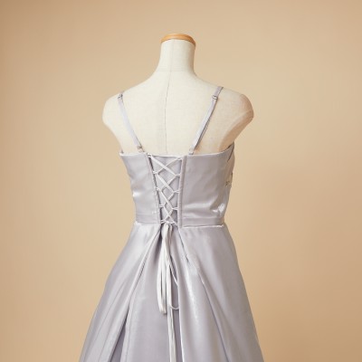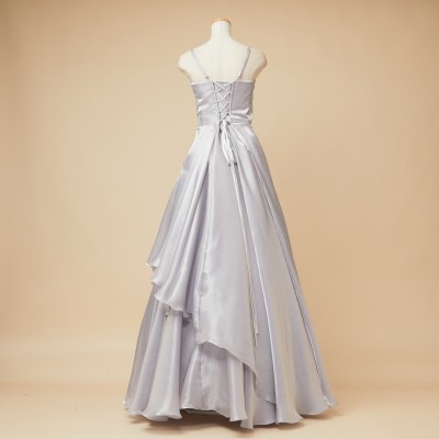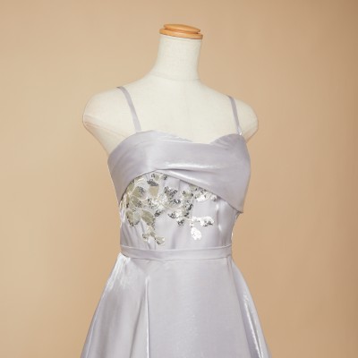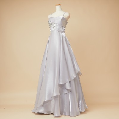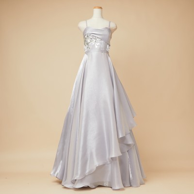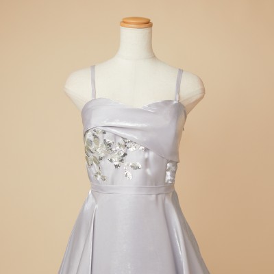 艶やかな光沢のシルバーカラーサテン生地を使用した、アシンメトリーレイヤースカートドレスです。胸元のさりげないスパンコール刺繍がデザインのアクセント。比較的重さの無い軽やかなサテンなので、パニエでスカートを広げれば美しいAラインドレスとしてもご着用いただけます。