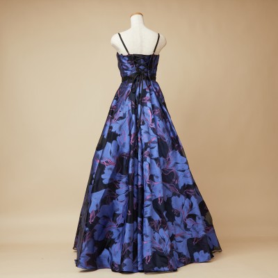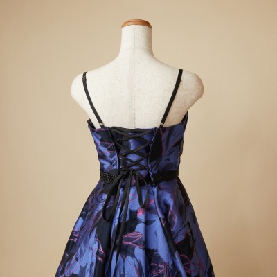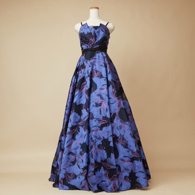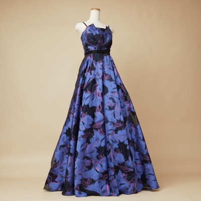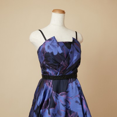 ネイビー×ブラックの抽象的な花柄ジャガード生地をふんだんに使用したフレアスカートのAラインドレス。柄のポイントにビビッドピンクカラーのラメ糸を折り込んだシックなカラーでも個性的で華のあるデザインが魅力です。繊細な輝きを放つウエストの細かなブラックビーズベルトがアクセントに。パニエ無しでスタイリッシュな印象に、パニエを使用すればフレアスカートが大きく広がり豪華な雰囲気に早変わり。初めてドレスを着る方にもおすすめ出来るステージドレスです。