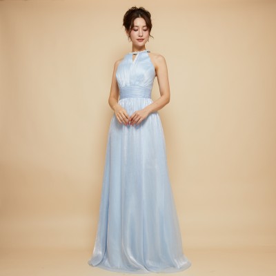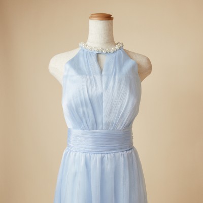 首元に華やかなボリュームのあるパールを連ねた、清楚なライトブルーカラーのホルターネックスタイルドレス。さらっと軽いワッシャー加工オーガンジーの個性的な風合いとペールトーンの落ち着いたカラーがとても上品な雰囲気です。
