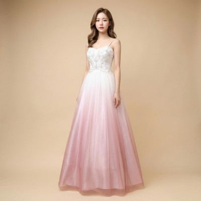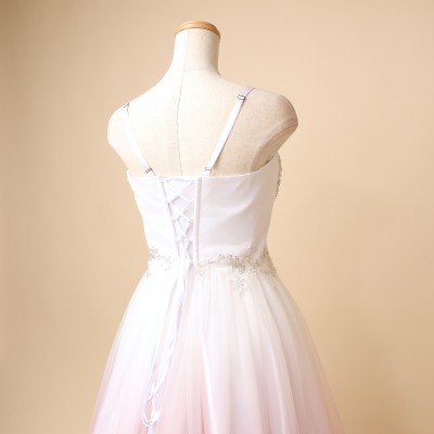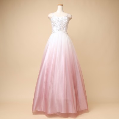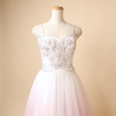 清楚なホワイトカラーをベースにした、淡いピンクグラデーションのAラインチュールドレス。胸元にはハートモチーフを思わせる、繊細で美しいビーズ刺繍が施されています。ふわっと軽やかで柔らかい質感のチュールに上品なグラデーションカラーが映える、美しく優雅なデザインです。