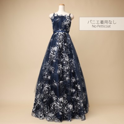 フロストシュガーの様な立体感のあるホワイトグリッターを使用した、ラグジュアリーボリュームチュールドレスです。抽象的なフラワー模様が大人っぽくエレガントな印象に。グリッターの華やかな輝きを引き立たせる、シックで上品なネイビーカラー。