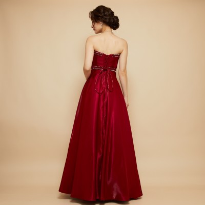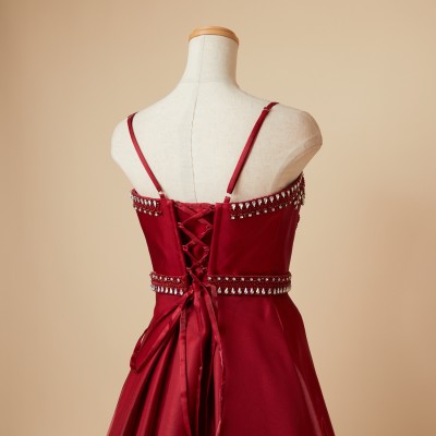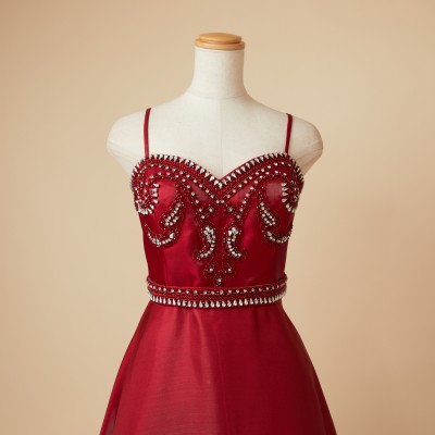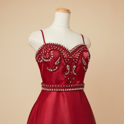 オーロラクリスタル装飾ルージュレッド艶サテンドレス