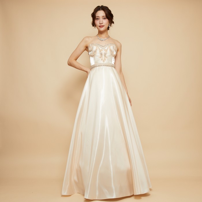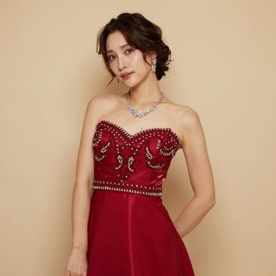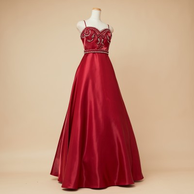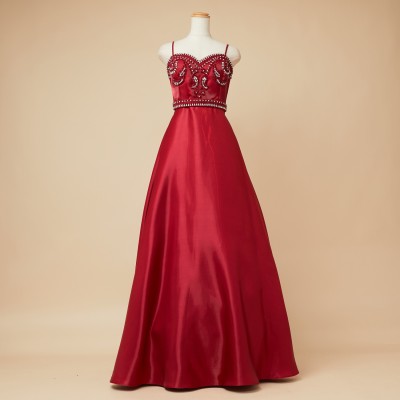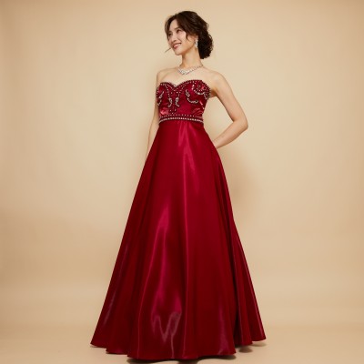 すっきりとしたウエストラインと深めのハートカットがエレガントな、シャイニーサテンドレス。身頃の煌びやかなオーロラクリスタルや深紅のカラービーズ刺繍は1着ずつ全て手作業で仕上げた、こだわり満載の贅沢なデザインです。艶やかで魅力的なルージュレッドカラー。