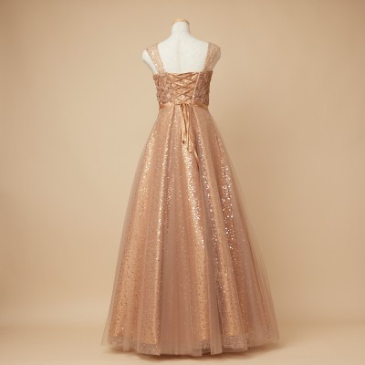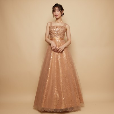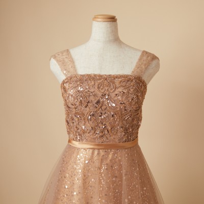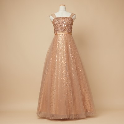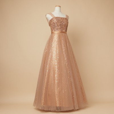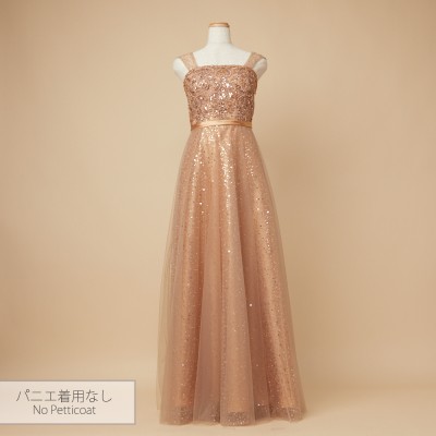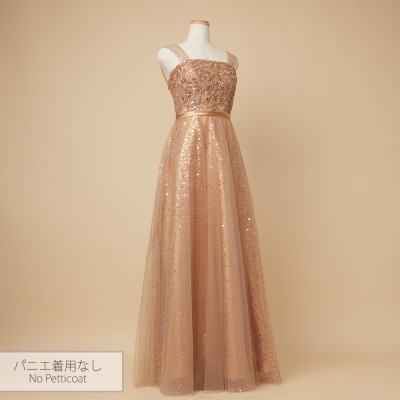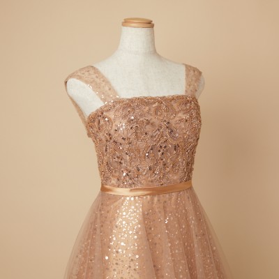 エスニックなゴールドブロンズカラーのチュールフレアドレス。ビーズやスパンコールの装飾をふんだんにあしらった、胸元の豪華な装飾の煌びやかさに目を惹かれます。スカートにもビーズやスパンコールの華やかな装飾があるので、パニエを使ってスカートを広げた着こなしがお勧めです。