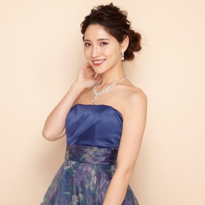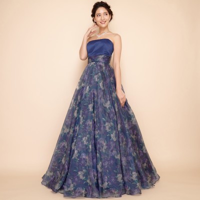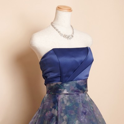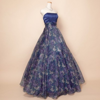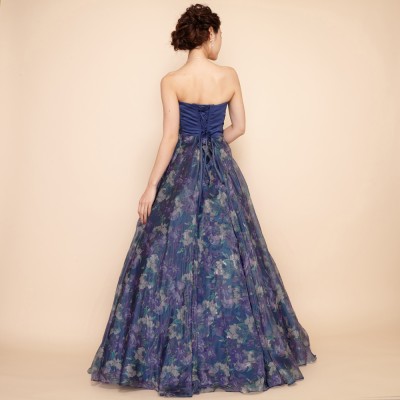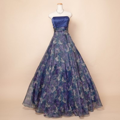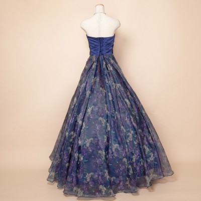 光沢のあるオーガンジーにクラシカルなフラワープリントが華やかなステージドレス。シックなカラーに浮かび上がるパープルフラワーがアクセントの、大人の女性にぜひ着ていただきたいエレガントなデザインが魅力です。