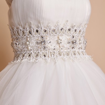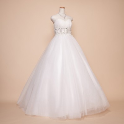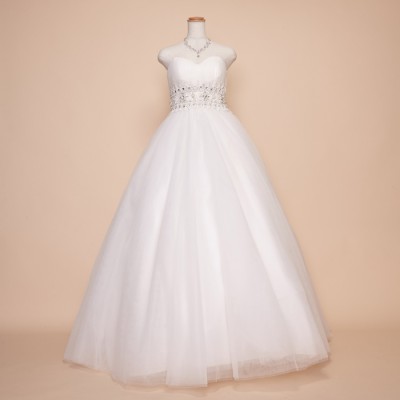 ボリュームたっぷりのチュールスカートにウエストのビーズ装飾が目を惹くウエディングドレスです。