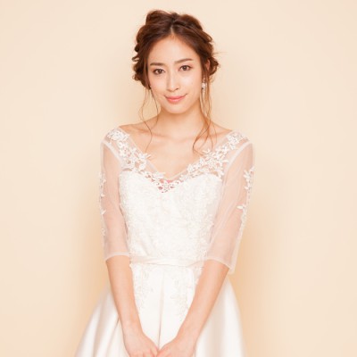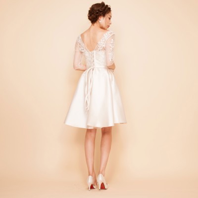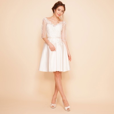 上品なツイル生地にチュールとレースを重ねた、5分袖のミディドレスです。柔らかな雰囲気のアイボリーカラーはウエディングの2次会ドレスにおすすめ。