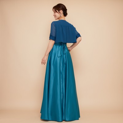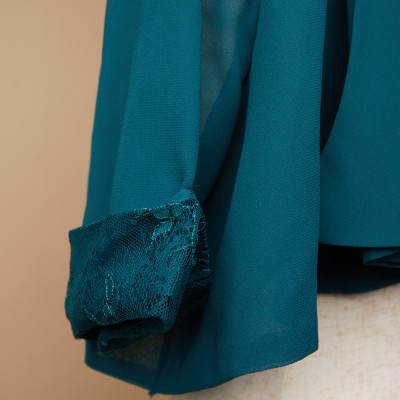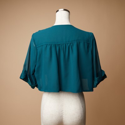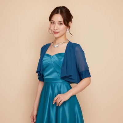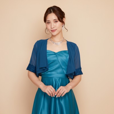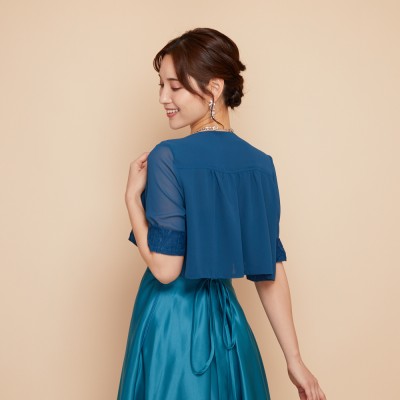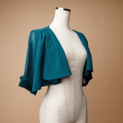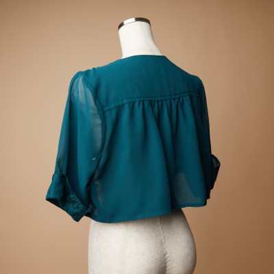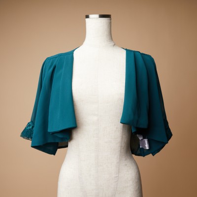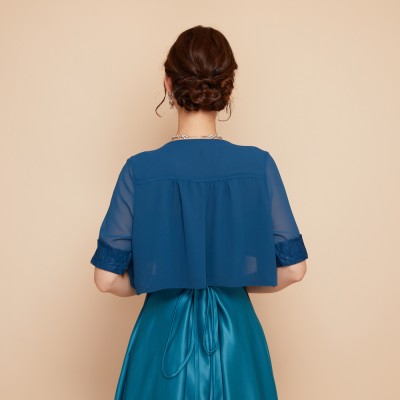 五分袖シフォン生地にレースの折り返しが上品な、ショートジャケットスタイルのボレロです。場面を選ばず使いやすいシンプルなデザインが魅力。
