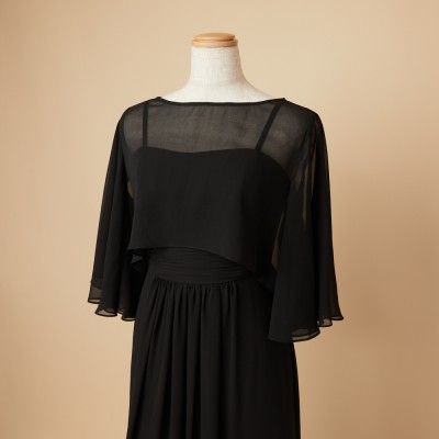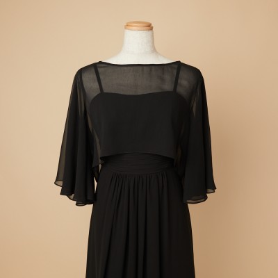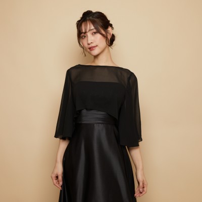 透け感のある軽やかなシフォン生地を使用した、ブラックカラーのフレアスリーブケープボレロ。腕周りが動かしやすいようフレアスリーブデザインを採用することで、見栄えの美しさと機能性を兼ね備えた万能なケープボレロです。