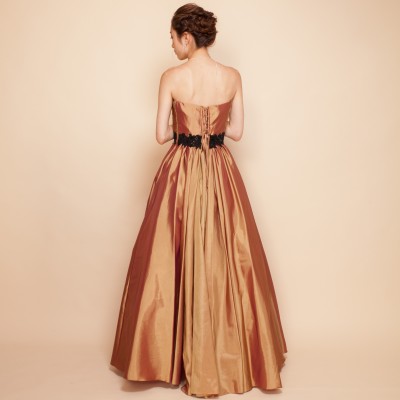 定番大人気の演奏会ドレス。気品あるクラシカルなデザインのAラインドレスです。ギャザーをふんだんにあしらったスカートは、ボリュームパニエを使えばさらに豪華にみせる事も可能。ドレスを初めて着る方にも扱いやすい、丈夫なタフタ生地を使用しています。見る角度によって色がゴールドやパープルに変化する個性的なカラーです。
