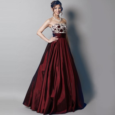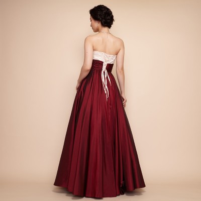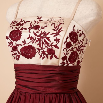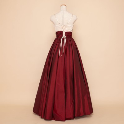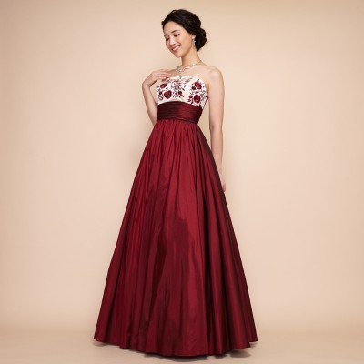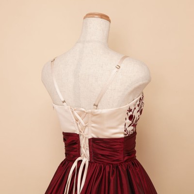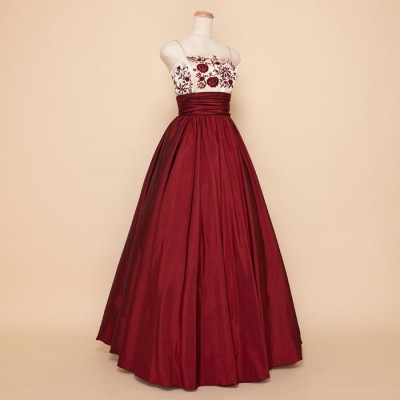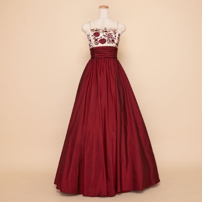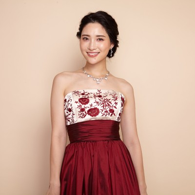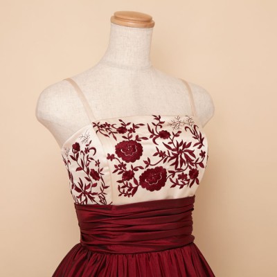 胸元の刺繍が印象的なバイカラーのステージドレスです。スタンダードなAラインスタイルなので、初めてドレスを選ぶ方にもおすすめ。ウエストマークが幅広なので、身長の低い方でもバランス良く着こなすことができるデザインです。スカート生地には軽く丈夫なタフタを使用しているので耐久性も◎。一番人気のワインレッドはステージ映え・写真映え抜群!シックなワインカラーも胸元のアイボリーとのバイカラーデザインで暗くなり過ぎないよう配色に工夫を凝らした、大人可愛いカラーです。