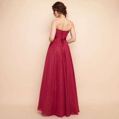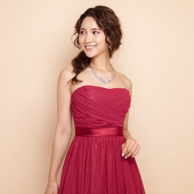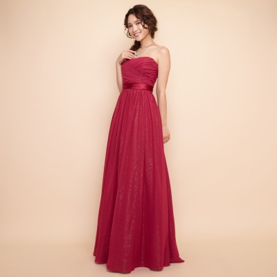 ゴールドグリッターを散りばめたシフォン生地をドレス全体に使用したすっきりとしたラインのステージドレスです。シンプルデザインながらもグリッターがアクセントになっていてこなれ感を演出してくれますよ!フーシャよりも赤みの強いベリーピンクカラーは、少し大人っぽい装いのドレスとしてお召しいただけます。