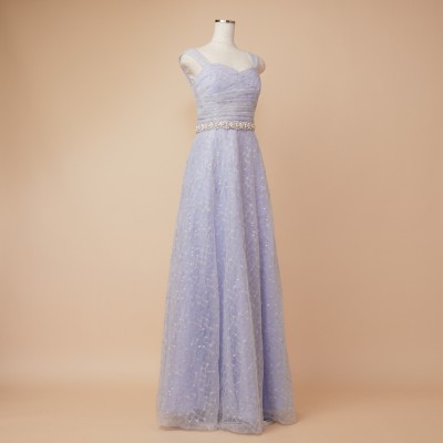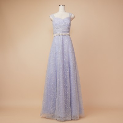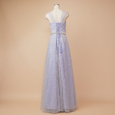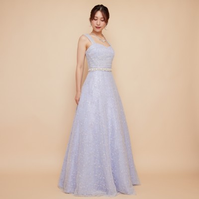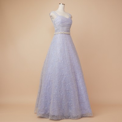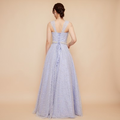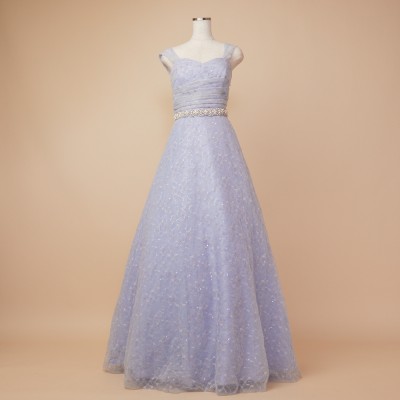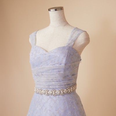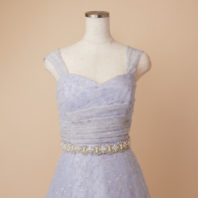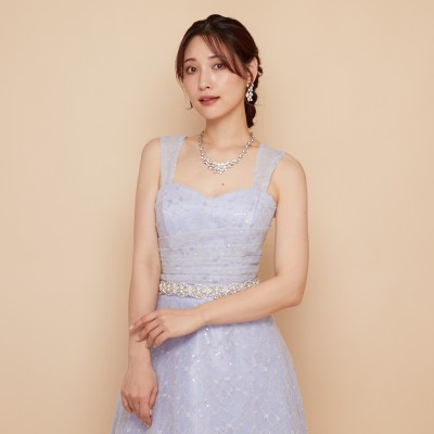スパンコール装飾レースを使用したアイスブルーカラーのフレアチュールドレス。白い小花を散らした可愛らしいレース生地に、くすみブルーのチュールを纏わせ、ウエストには華やかなボリュームのデザインベルトを合わせました。また、人気の幅広肩紐デザインで安定感のある着心地に。パニエでふんわりスカートを広げてより可愛らしくより華やかに、パニエ無しでエレガントなラインをキープし大人っぽく等、お好みのスタイルでご着用ください。