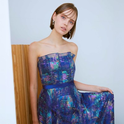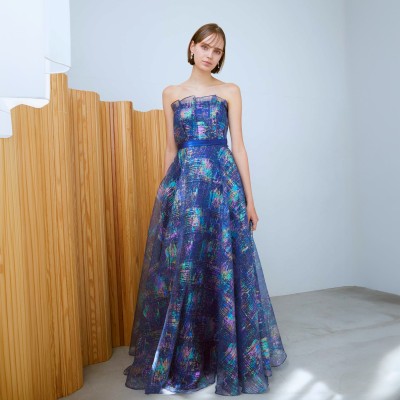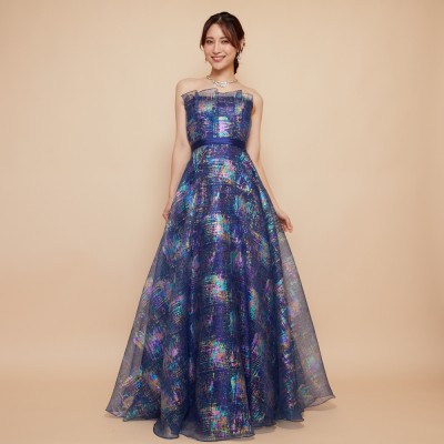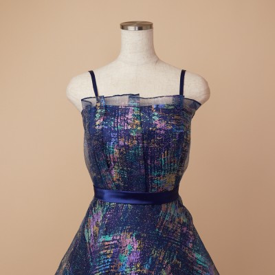 虹色に輝くホログラムラメが個性的なフレアスカートのオーガンジードレス。
