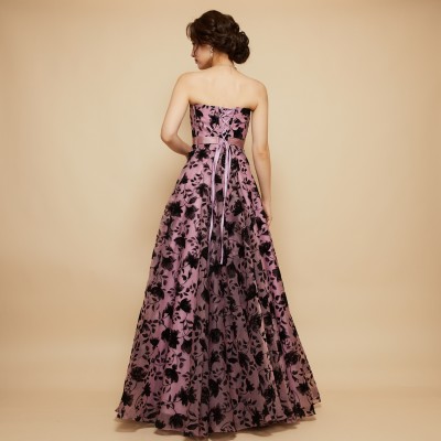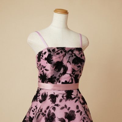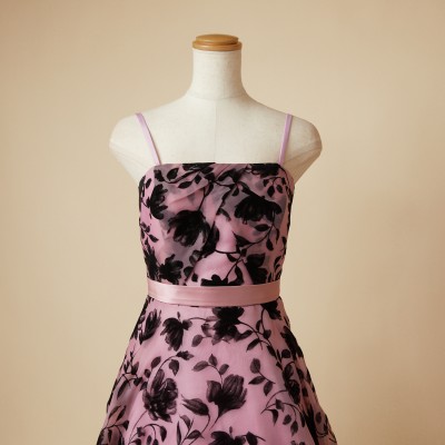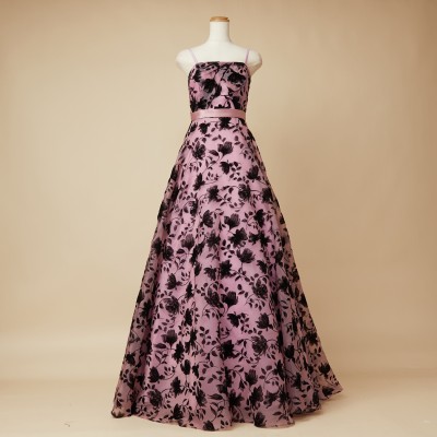 艶やかなオーガンジーに印象的なブラックフラワーフロッキーをプリントしたAラインフレアドレス。立体的に見えるよう柄に柔らかな陰影を付けた、デザイナーこだわりフロッキープリントがポイントです。オペラモーブの可愛らしいピンクカラーがブラックカラーをひと際引き立てるエレガントなステージドレスです。