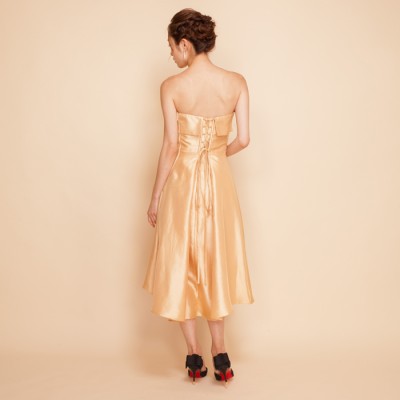 ゴールドカラーのシャンタン生地を使用した、エレガントなテールカットのミディドレスです。