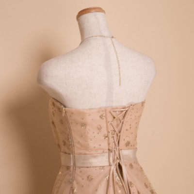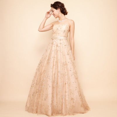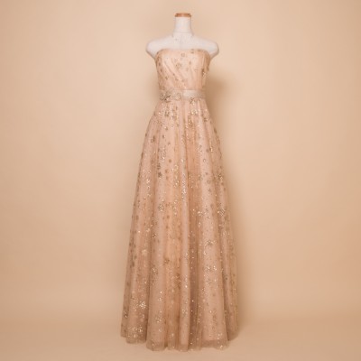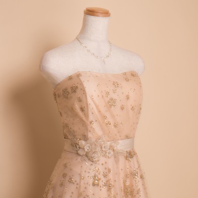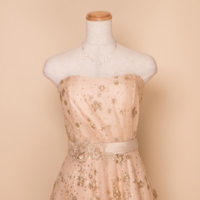 ベルト部分のフラワー刺繍モチーフが可憐さのアクセント。スカート部分もマネキンの写真のように中に着用するパニエ次第で大きく広げる事も可能です。派手過ぎない、大人のゴールドカラーです。