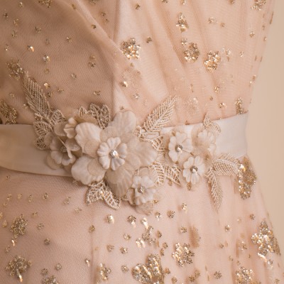 ドレス全体にグリッターを花模様にして散りばめたチュールを使用したステージドレス。全体のグリッターがスポットライトに反射し華やかに輝きます。