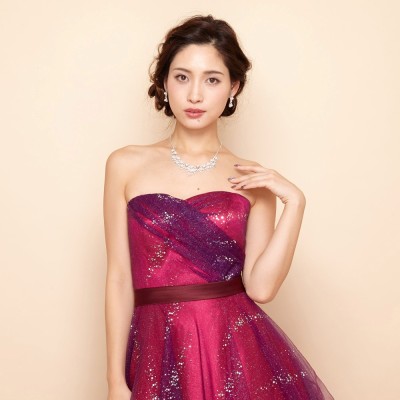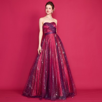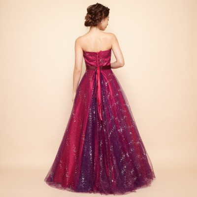 チュール全体に散りばめられたグリッターがキラキラとステージライトに反射する、とっても華やかなAラインロングドレス。まるで宝石箱から飛び出したかのような豪華な輝きです。フーシャ色のサテン生地に2色のパープルカラーチュールを重ねることで、xy265シリーズの中では最もグラデーションが映えるカラーに仕上がりました。