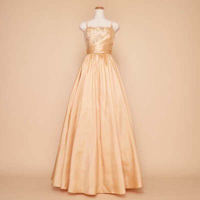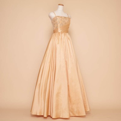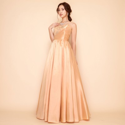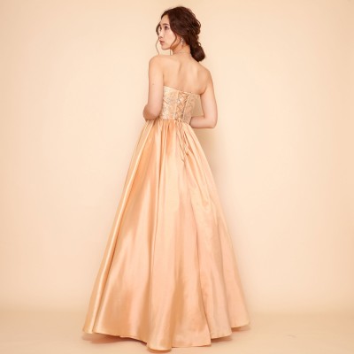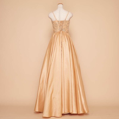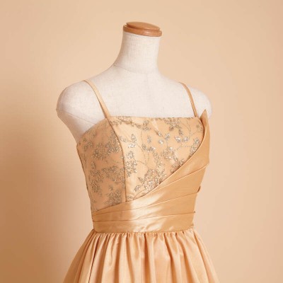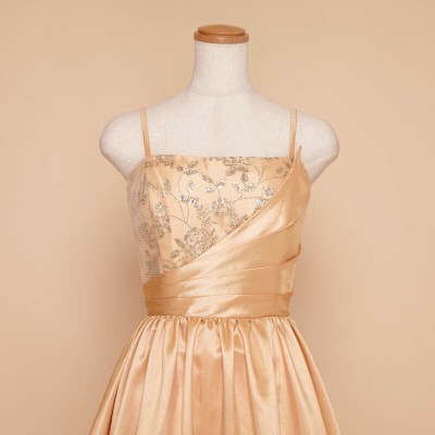 煌びやかな光沢のシャンタン生地をドレス全体に贅沢に使用したAラインシルエットのステージドレスです。胸元にはキラキラと光るグリッターチュールを使用し、シンプルなデザインながらも華やかな装いに。肌なじみの良い、艶ややかなイエローゴールドカラーです。