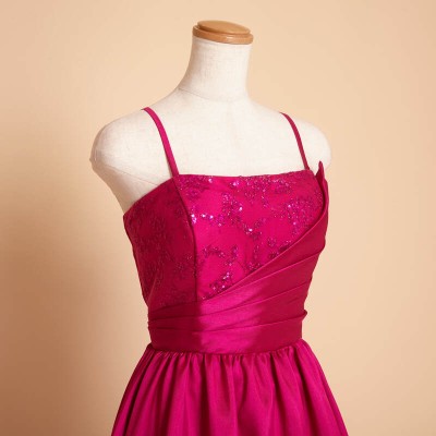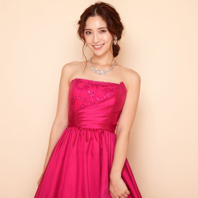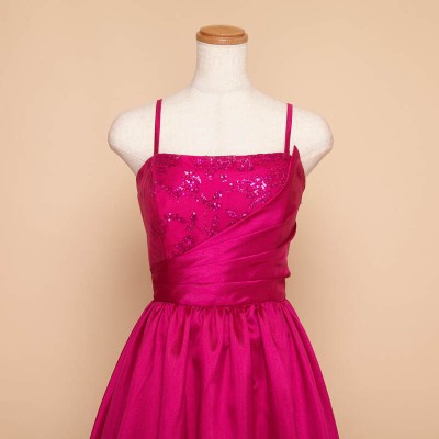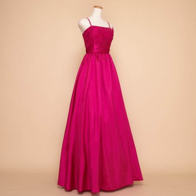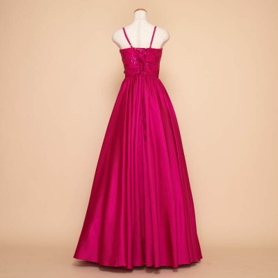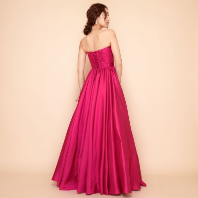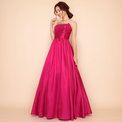 煌びやかな光沢のシャンタン生地をドレス全体に贅沢に使用したAラインシルエットのステージドレスです。胸元にはキラキラと光るグリッターチュールを使用し、シンプルなデザインながらも華やかな装いへ。ステージ映え・写真映えする鮮やかなマゼンダは大人可愛い印象に。花嫁様の2次会衣装にもおすすめです。
