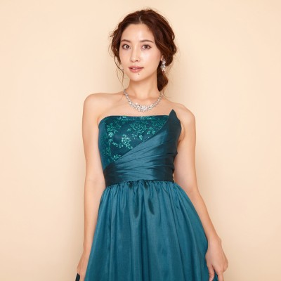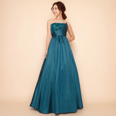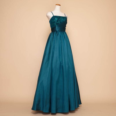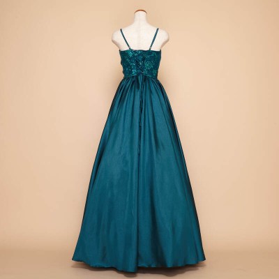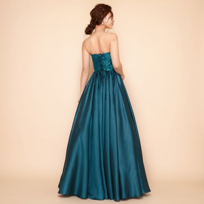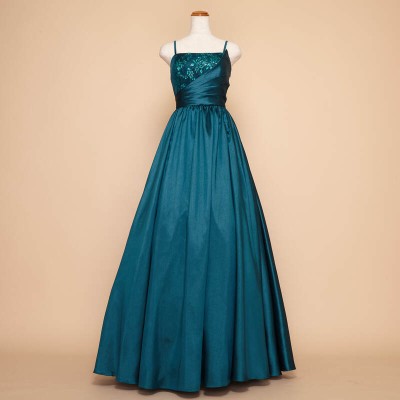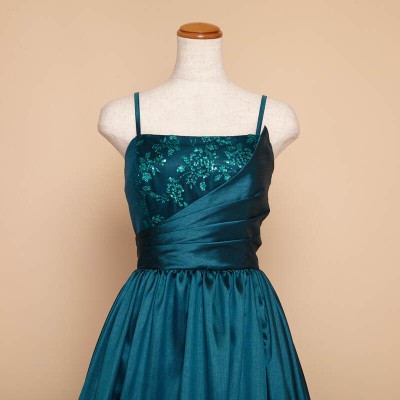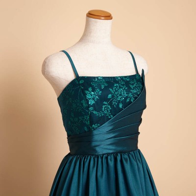 煌びやかな光沢のシャンタン生地をドレス全体に贅沢に使用したAラインシルエットのステージドレスです。胸元にはキラキラと光るグリッターチュールを使用し、シンプルなデザインながらも華やかな装いに。鮮やかで少しダークなエメラルドグリーンはクリスマスシーズンに大人気!エレガントな雰囲気がお好きな方に。