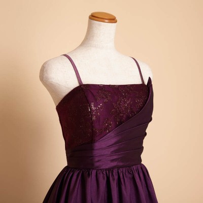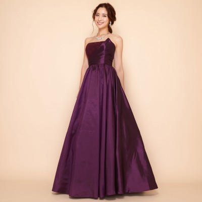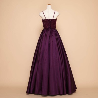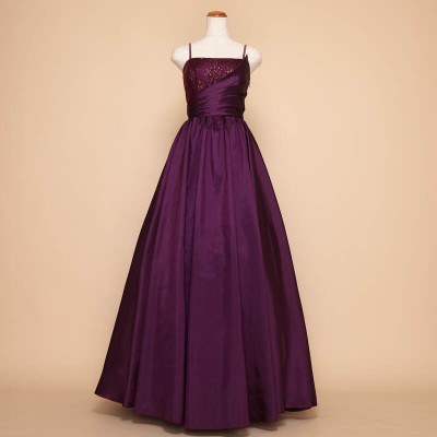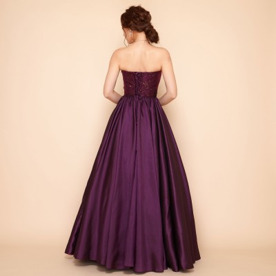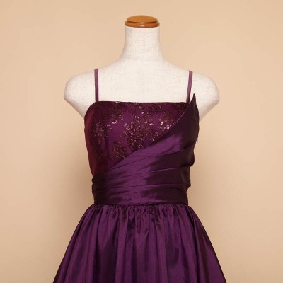 煌びやかな光沢のシャンタン生地をドレス全体に贅沢に使用したAラインシルエットのステージドレスです。胸元にはキラキラと光るグリッターチュールを使用し、シンプルなデザインながらも華やかな装いに。しっとりと聴かせたい曲目には、高級感ある高貴なパープルカラーをどうぞ。