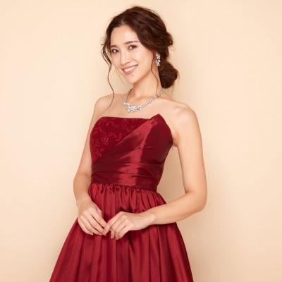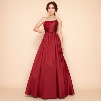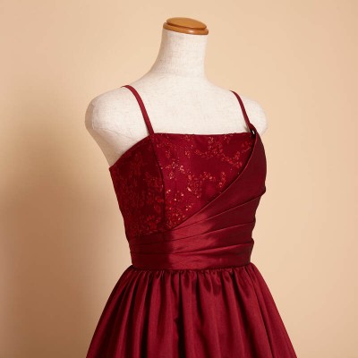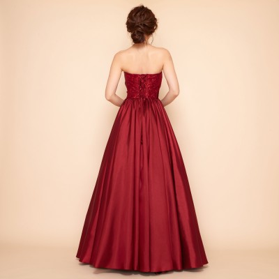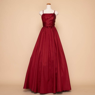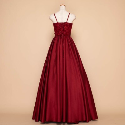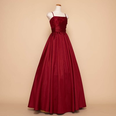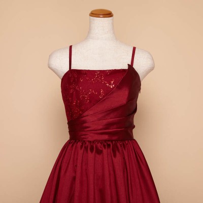 煌びやかな光沢のシャンタン生地をドレス全体に贅沢に使用したAラインシルエットのステージドレスです。胸元にはキラキラと光るグリッターチュールを使用し、シンプルなデザインながらも華やかな装いに。美しい発色と光沢のワインレッドは年間通して最も人気のあるカラーです。