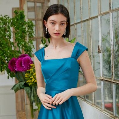 しっとりとした厚手サテンを使用したシンプルデザインのステージドレス。サテン特有のリッチな光沢はとても高級感があります。幅広の肩紐付きなので初めてドレスを着る方も安心してご着用いただく事ができ、また、この肩紐は着脱タイプなのでガラッと雰囲気を変えたベアトップドレスへとイメージチェンジも可能です。