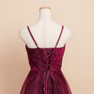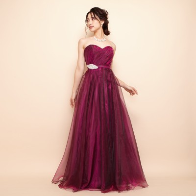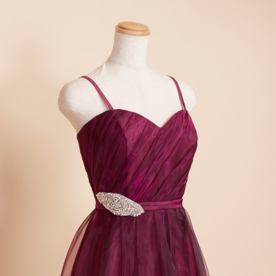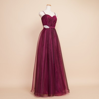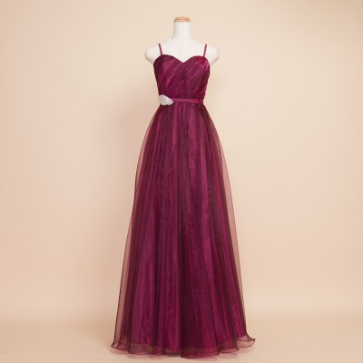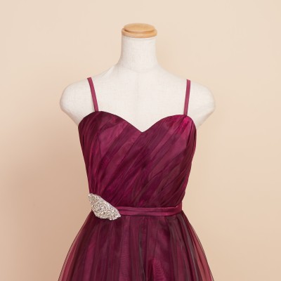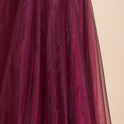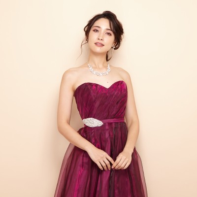見る角度によって色が変わる艶めきオーガンジーは、まるでオーロラのベールを纏ったかのような雰囲気。軽やかな着心地とシンプルなデザインは季節問わずに着用出来るので着回し力も抜群です。ワンポイントのウエストモチーフがさりげなく輝き、しっとりと落ち着いた大人の女性に良く似合うドレスに仕上げました。熟した赤ぶどうのような芳醇で深みのあるオーロラレッドパープルカラー。