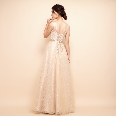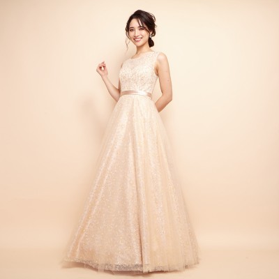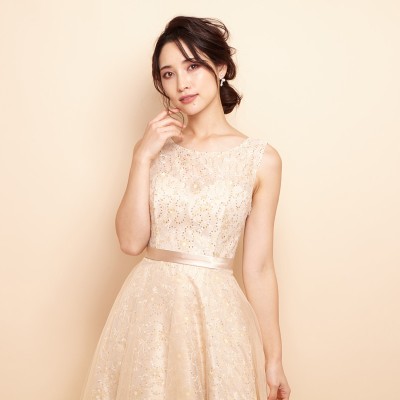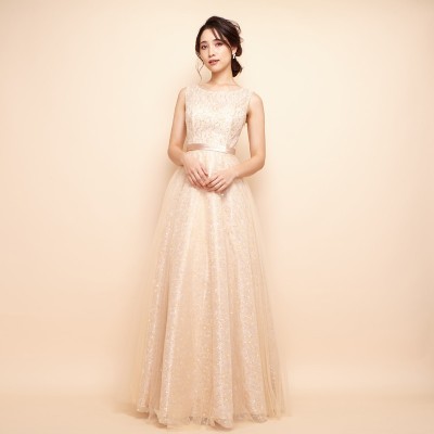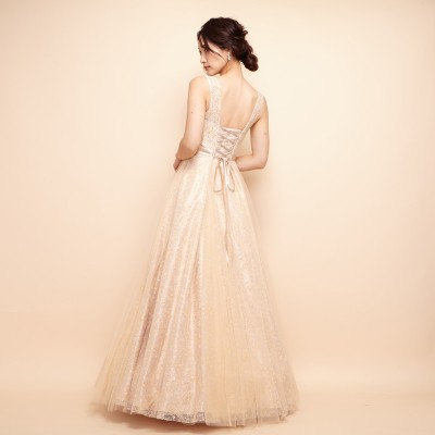 美しい細身シルエットのAラインチュール&レースフレアドレスです。ラメ糸を使ったレースにはゴールドスパンコールが縫い込まれており、ライトの下では上品で繊細な輝きを放ちます。スレンダードレスのようなデザインですが、パニエで程よく広がるフレアスカートも魅力。ステージドレスにもパーティドレスにも幅広くお使いいただけます。肌色の美しさが際立つ、上品なシャンパンカラーです。