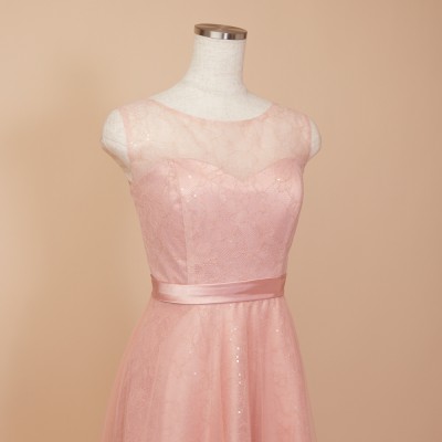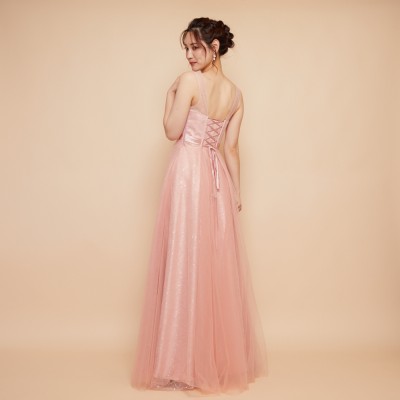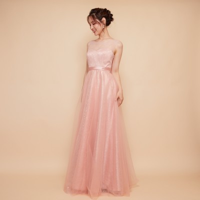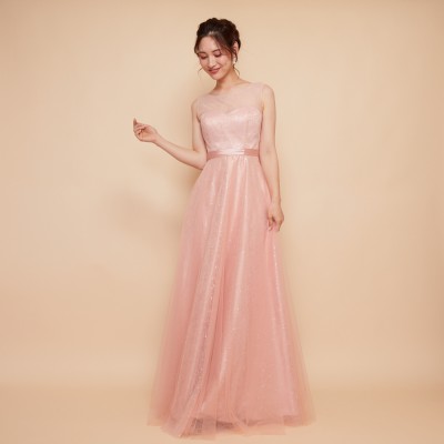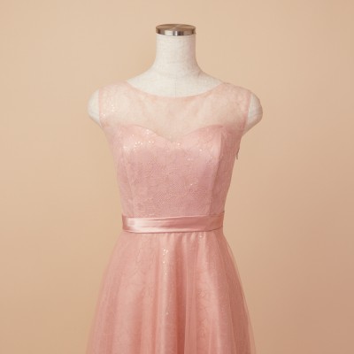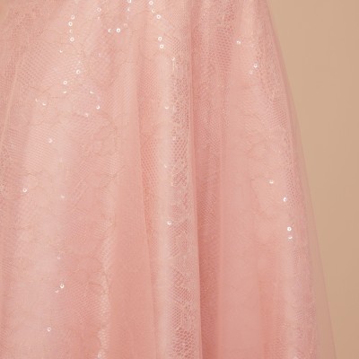 暖かみのあるコーラルピンクカラーのクリアスパンコール装飾レース生地を贅沢に使用した、フィット&フレアスタイルのステージドレス。レース生地に使用している、ほんのりと煌めくゴールドの刺繍糸が繊細な美しさよりを引き立てます。フレアの大きいスカートなので、パニエを使用した着こなしにも対応。お好みのスタイルでご着用ください。