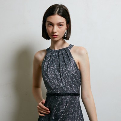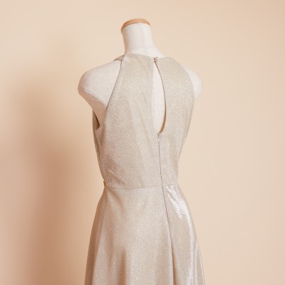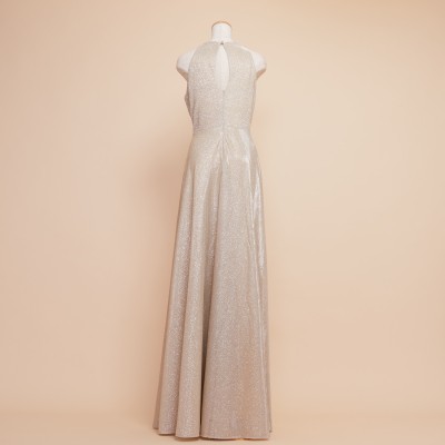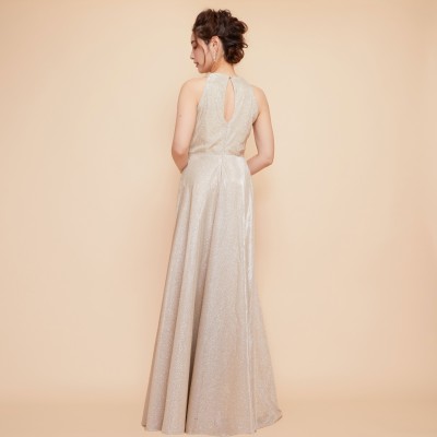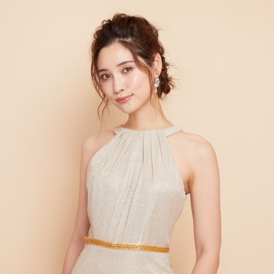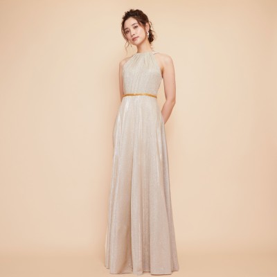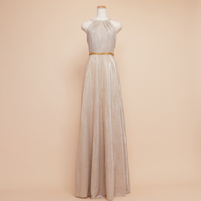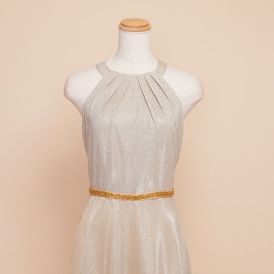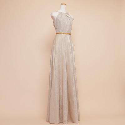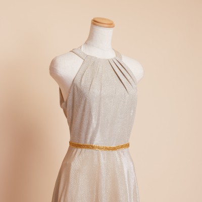 大人の魅力あふれるホルターネックデザインのスレンダードレス。はじけるように華やかに輝くドレスはステージ演出を一層引き立てます。腕周りが動かしやすいデザインなので、ピアノ演奏・バイオリン演奏にもおすすめです。繊細な煌めきが気品ある、レディライクなシャンパンゴールドカラー。