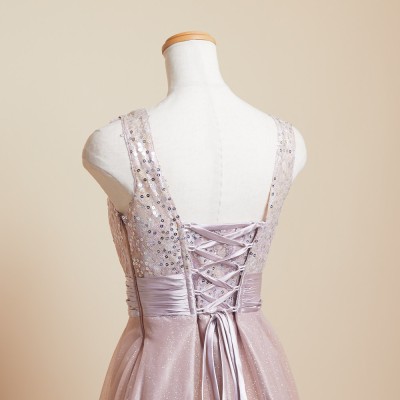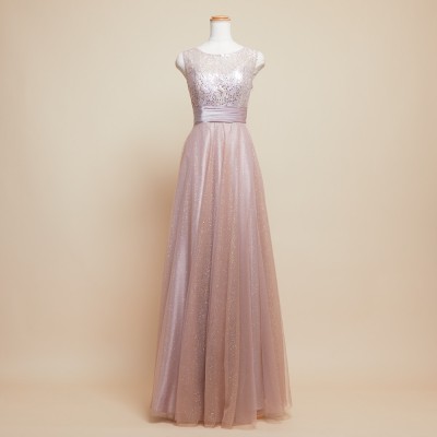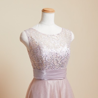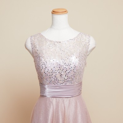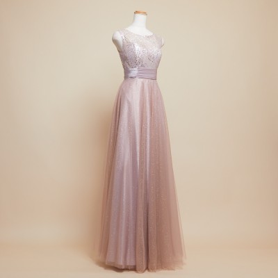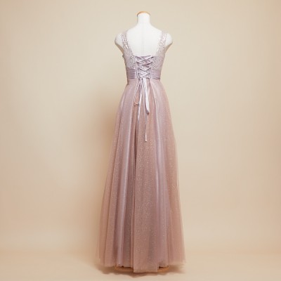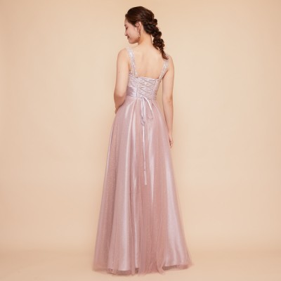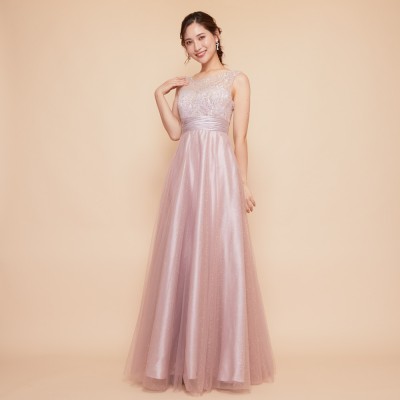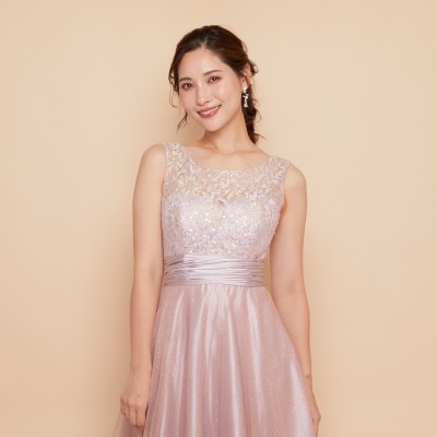 大人可愛いを叶えるダスティローズカラーが上品な印象のスレンダースタイルドレス。柔らかなチュールスカートにちりばめられた微小なグリッターの繊細な輝きと、身頃のスパンコール刺繍レースの煌めきがとても優雅です。ウエストの幅広サテンギャザーが身頃をコンパクトに見せるのでスタイルアップ効果も期待できます。